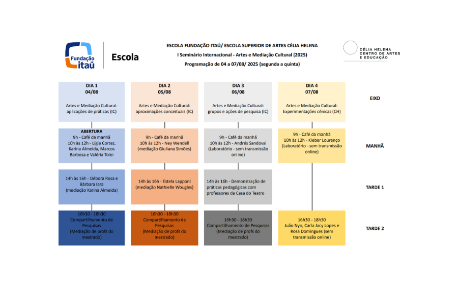 Iniciativa da Escola Superior de Artes Célia Helena (ESCH) em parceria com a Escola Itaú Cultural, o evento é vinculado ao programa de Mestrado Profissional em Artes da Cena — Laboratório em Artes e Mediação Cultural e tem como propósito difundir e fortalecer pesquisas e práticas artísticas e profissionais relacionadas às artes e a mediação cultural em seus mais diversos contextos e formatos.